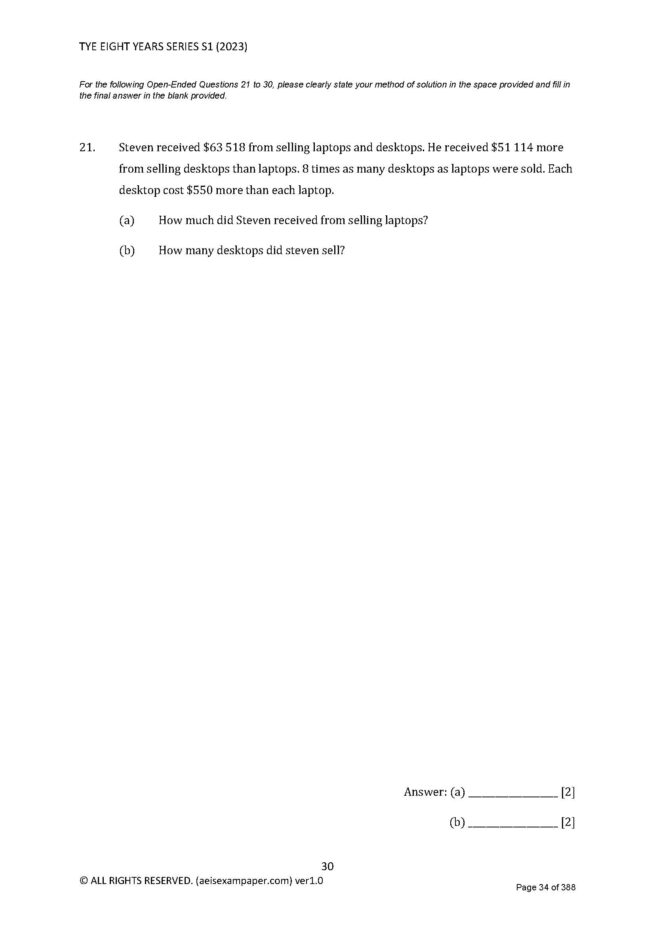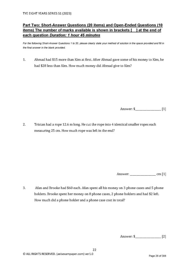 The use of calculators is not allowed. For short-answer and open-ended questions, your child must show their method of solution clearly by writing their working steps in the spaces provided in addition to providing the final answers.